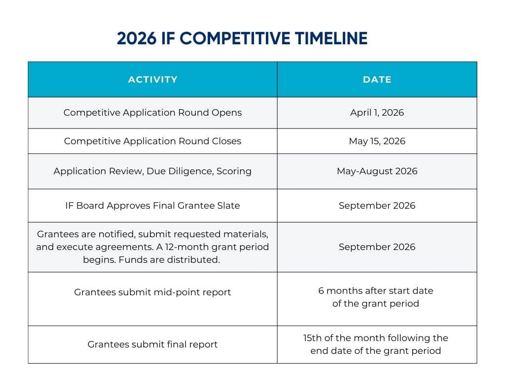 Please find the 2025 IF Competitive Round evaluation rubric here. This rubric is used by IF to assess applications. Applicants must submit all materials to be eligible to advance to an award of funding.